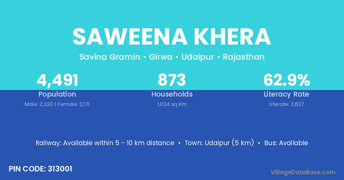 Udaipur (5 km) is the nearest town to Saweena Khera village for major economic activities and is located approximately 5 km away.