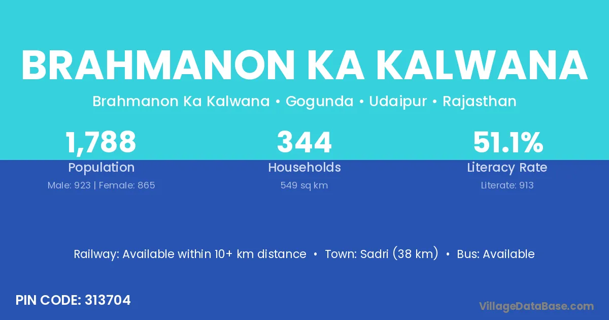 Sadri (38 km) is the nearest town to Brahmanon Ka Kalwana village for major economic activities and is located approximately 38 km away.