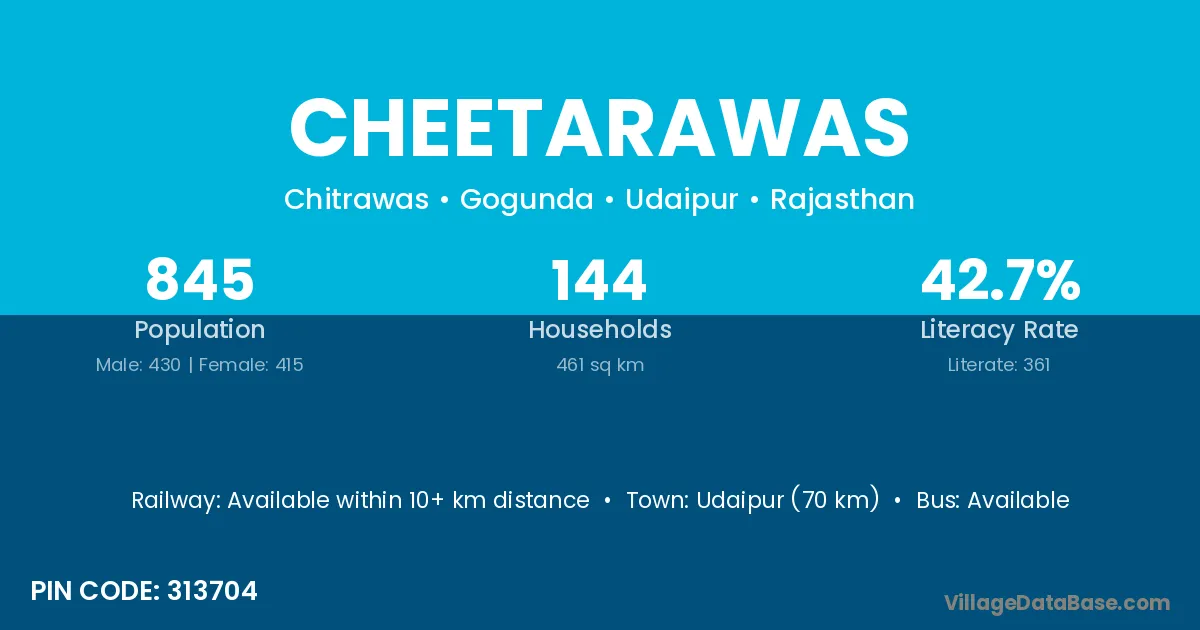 Cheetarawas village has a total population of 845 people, of which 430 are males and 415 are females.