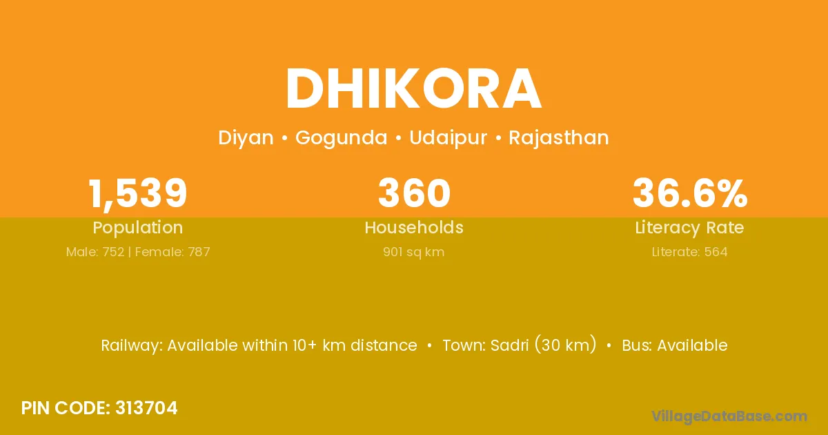 Sadri (30 km) is the nearest town to Dhikora village for major economic activities and is located approximately 30 km away.