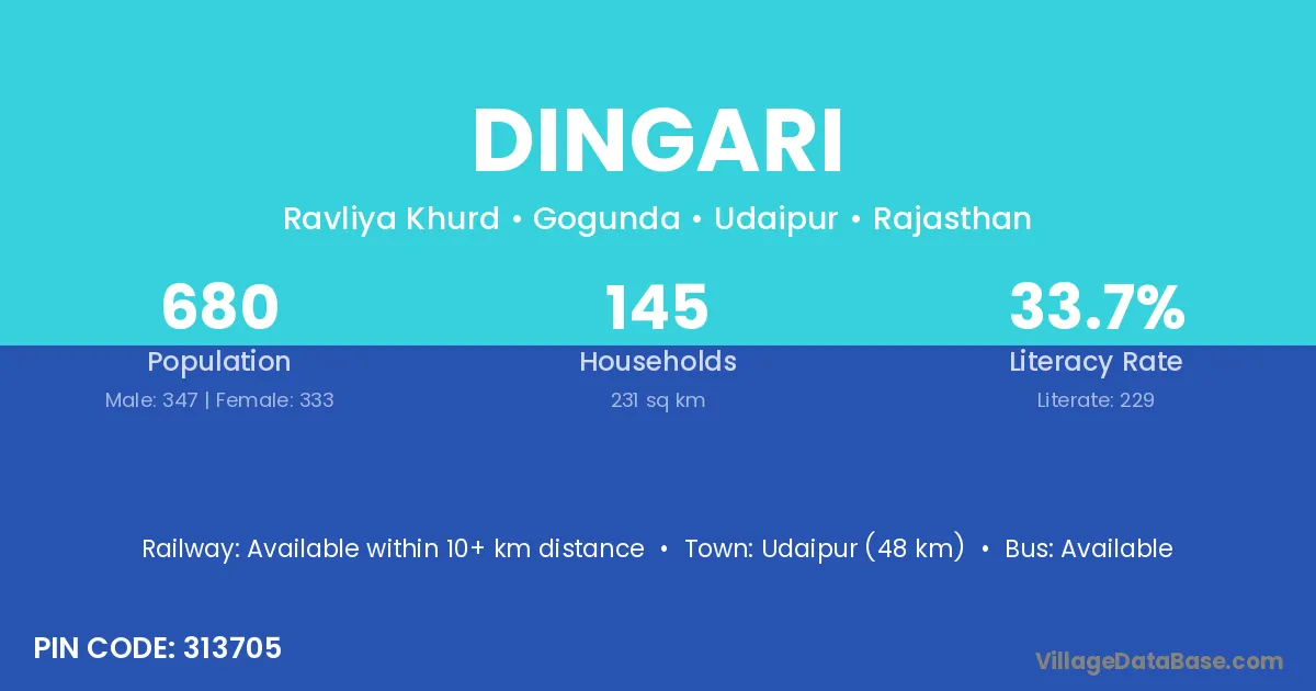 Udaipur (48 km) is the nearest town to Dingari village for major economic activities and is located approximately 48 km away.