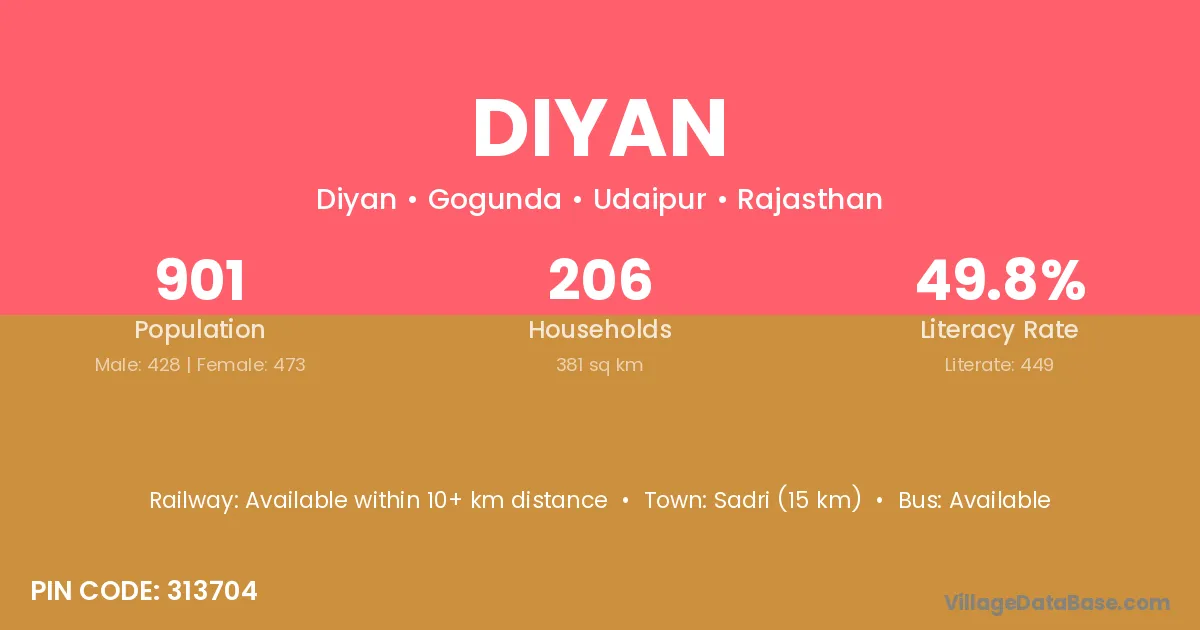 Sadri (15 km) is the nearest town to Diyan village for major economic activities and is located approximately 15 km away.