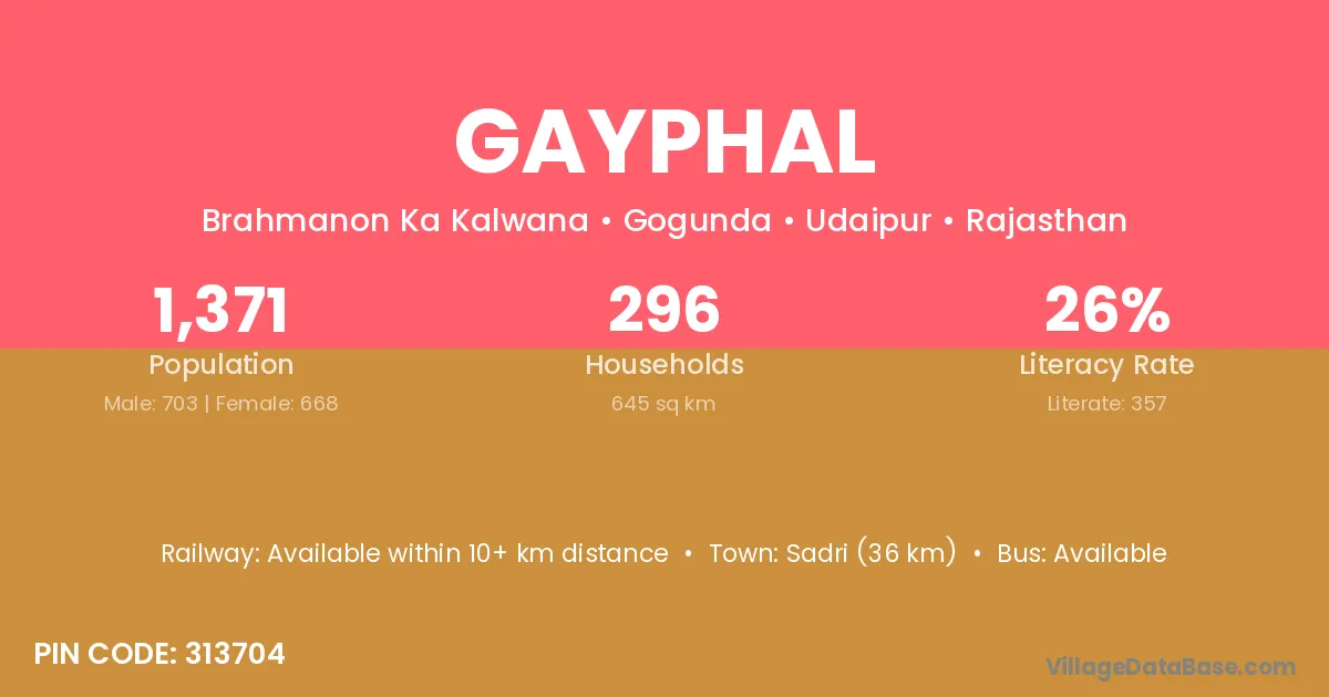 Sadri (36 km) is the nearest town to Gayphal village for major economic activities and is located approximately 36 km away.