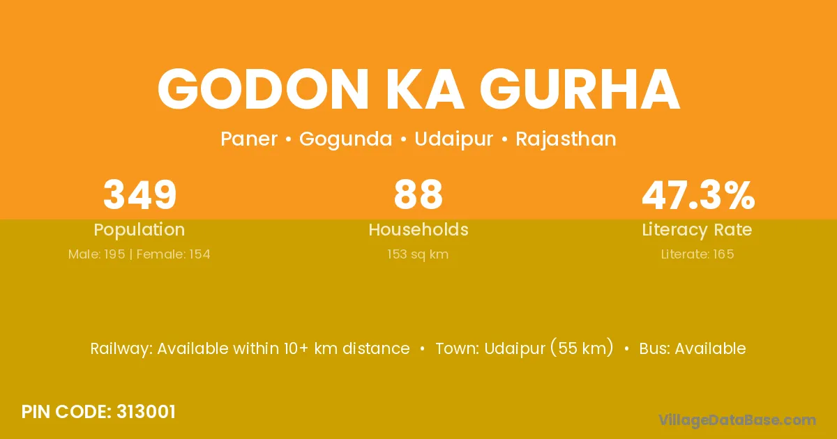 Udaipur (55 km) is the nearest town to Godon Ka Gurha village for major economic activities and is located approximately 55 km away.