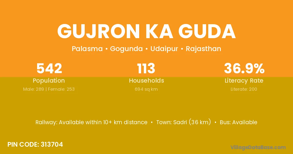 Gujron Ka Guda village has a total population of 542 people, of which 289 are males and 253 are females.
