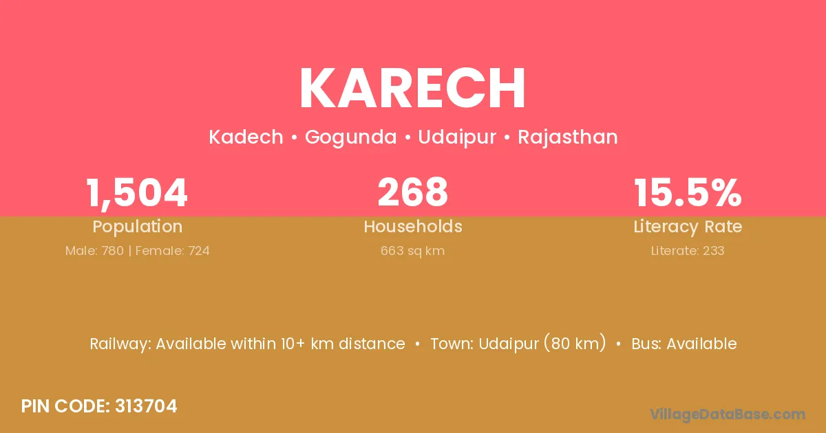 Karech village has a total population of 1,504 people, of which 780 are males and 724 are females.