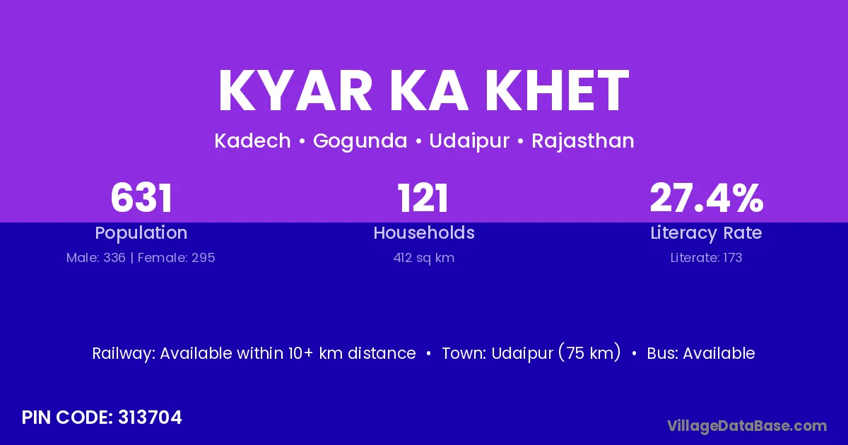 Udaipur (75 km) is the nearest town to Kyar Ka Khet village for major economic activities and is located approximately 75 km away.