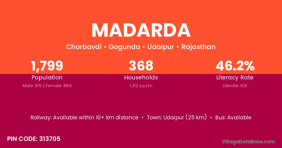 Udaipur (25 km) is the nearest town to Madarda village for major economic activities and is located approximately 25 km away.