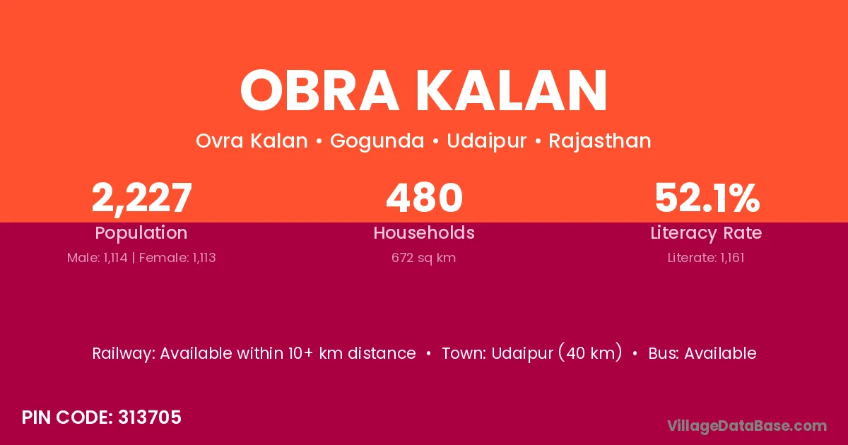 Udaipur (40 km) is the nearest town to Obra Kalan village for major economic activities and is located approximately 40 km away.