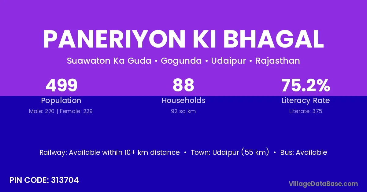 Udaipur (55 km) is the nearest town to Paneriyon Ki Bhagal village for major economic activities and is located approximately 55 km away.