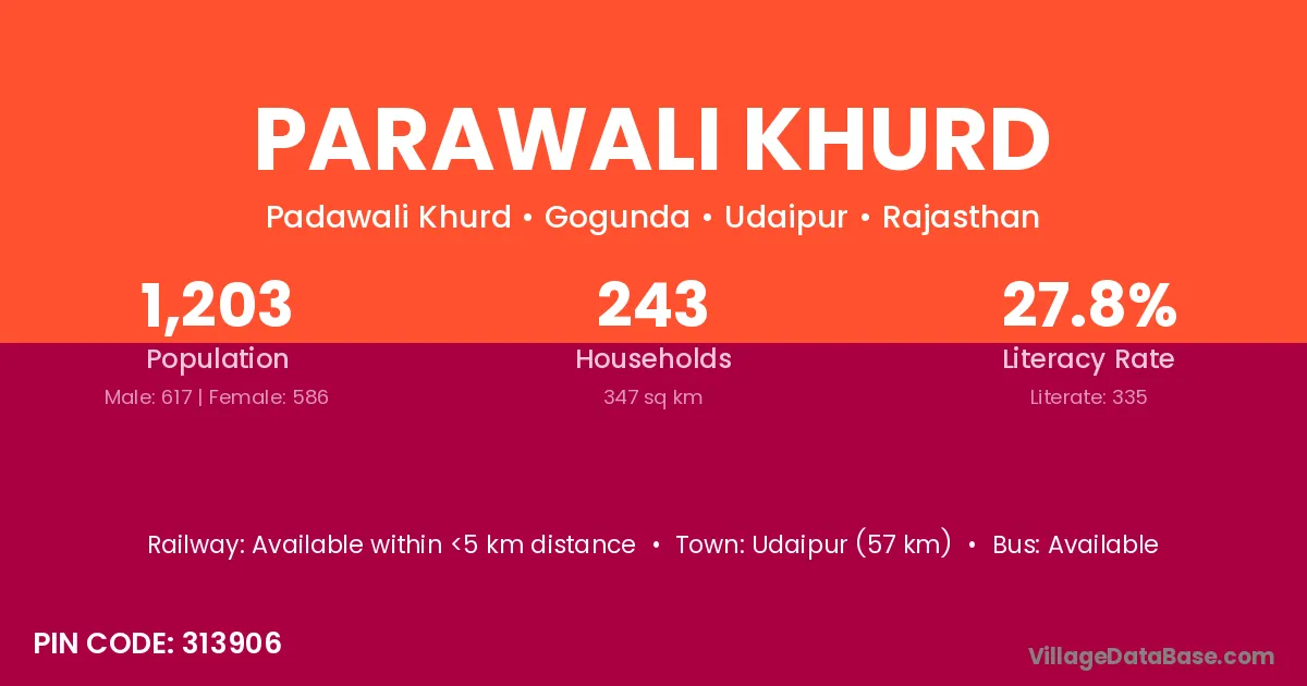Udaipur (57 km) is the nearest town to Parawali Khurd village for major economic activities and is located approximately 57 km away.