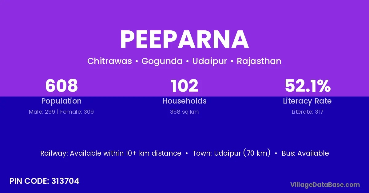 Udaipur (70 km) is the nearest town to Peeparna village for major economic activities and is located approximately 70 km away.