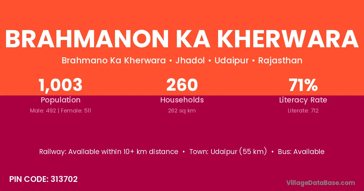 Brahmanon Ka Kherwara village has a total population of 1,003 people, of which 492 are males and 511 are females.