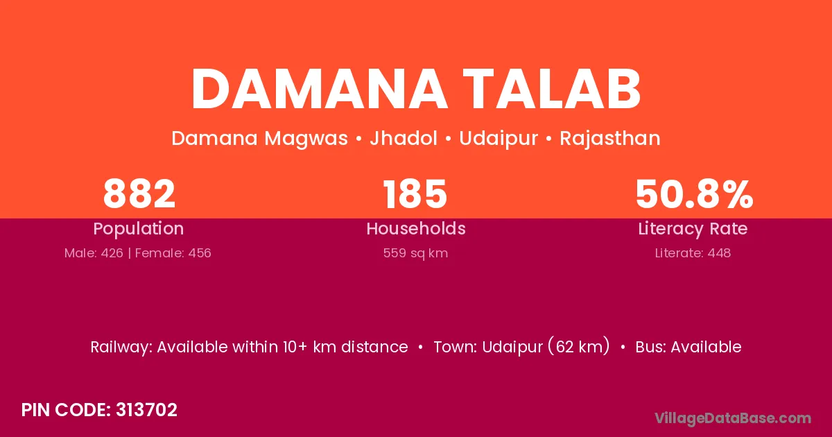 Udaipur (62 km) is the nearest town to Damana Talab village for major economic activities and is located approximately 62 km away.