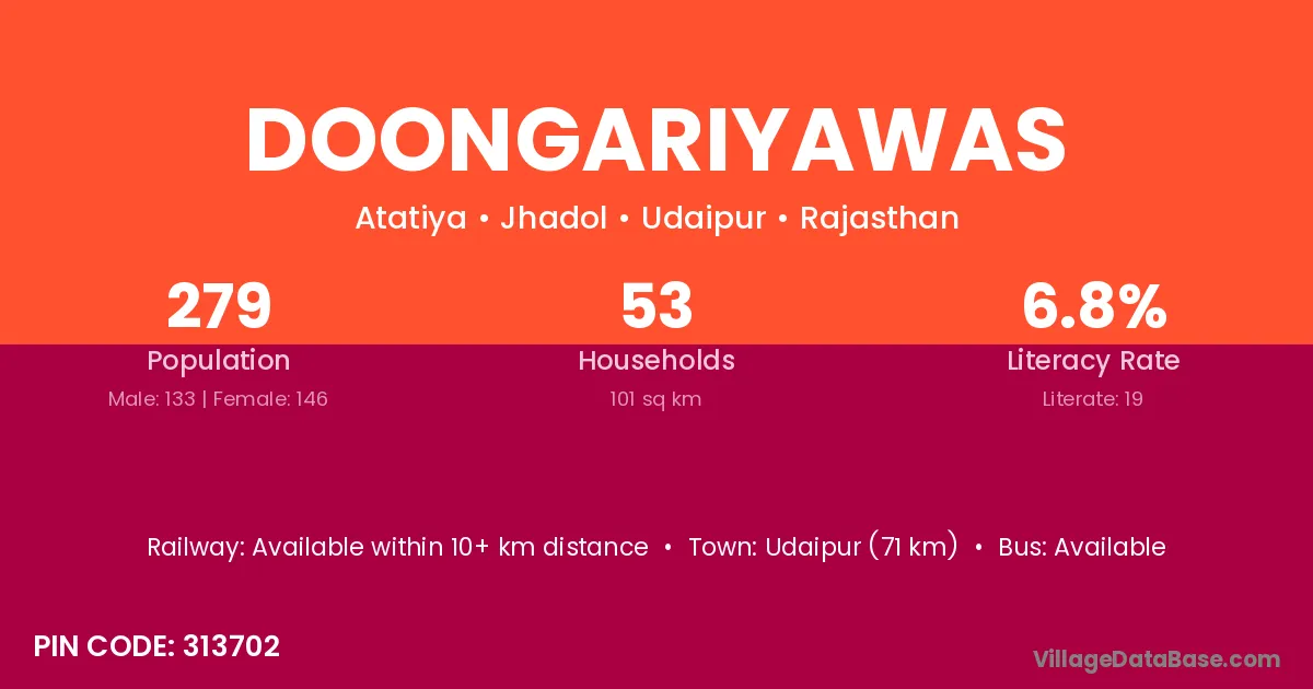Doongariyawas village has a total population of 279 people, of which 133 are males and 146 are females.