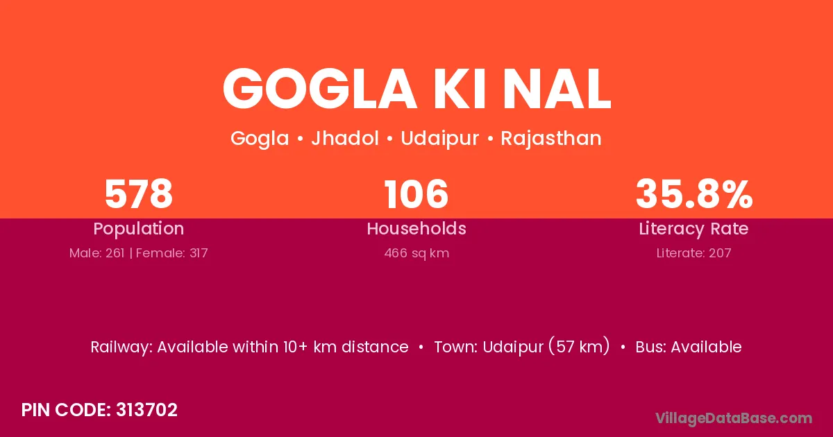 Udaipur (57 km) is the nearest town to Gogla Ki Nal village for major economic activities and is located approximately 57 km away.