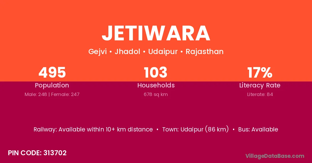 Jetiwara village has a total population of 495 people, of which 248 are males and 247 are females.