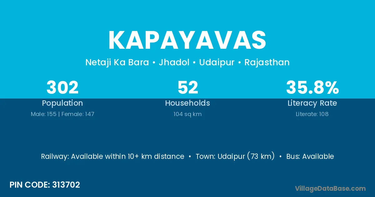 Udaipur (73 km) is the nearest town to Kapayavas village for major economic activities and is located approximately 73 km away.