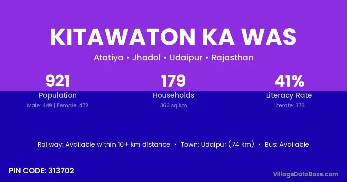 Udaipur (74 km) is the nearest town to Kitawaton Ka Was village for major economic activities and is located approximately 74 km away.