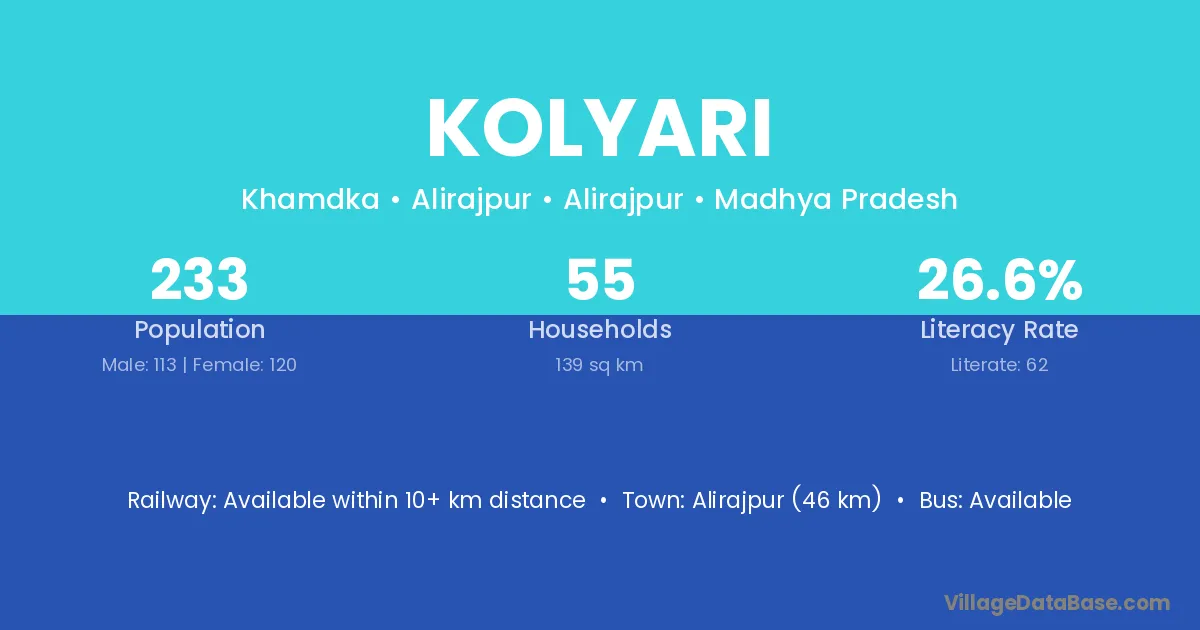 The literacy rate of Kolyari village is 59.32%. Male literacy stands at 70.46% and female literacy at 47.73%.