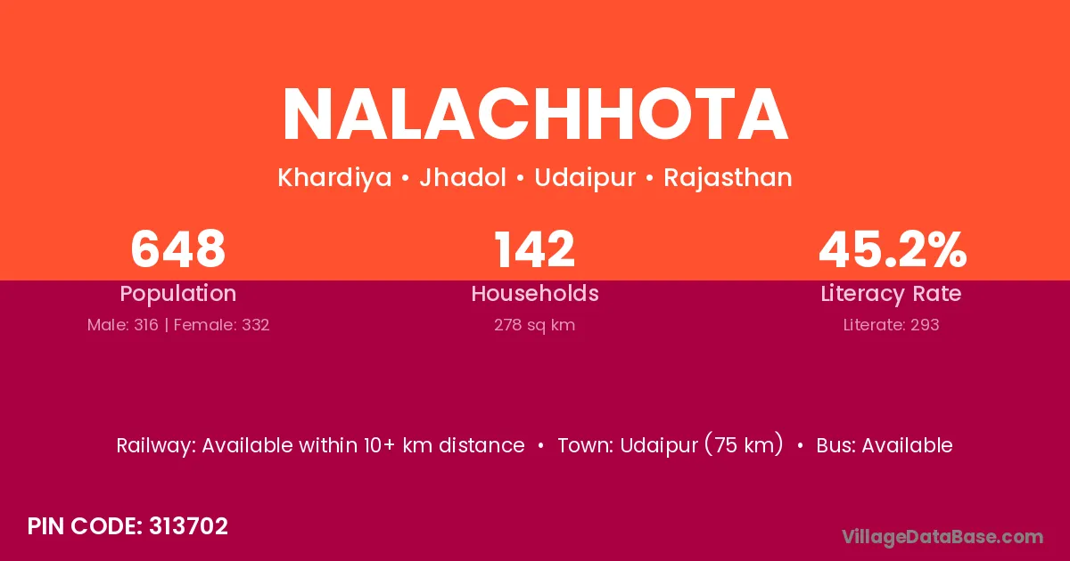 Udaipur (75 km) is the nearest town to Nalachhota village for major economic activities and is located approximately 75 km away.