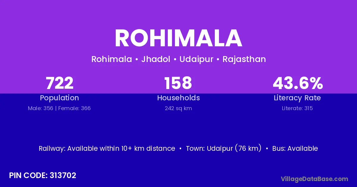 Rohimala village has a total population of 722 people, of which 356 are males and 366 are females.