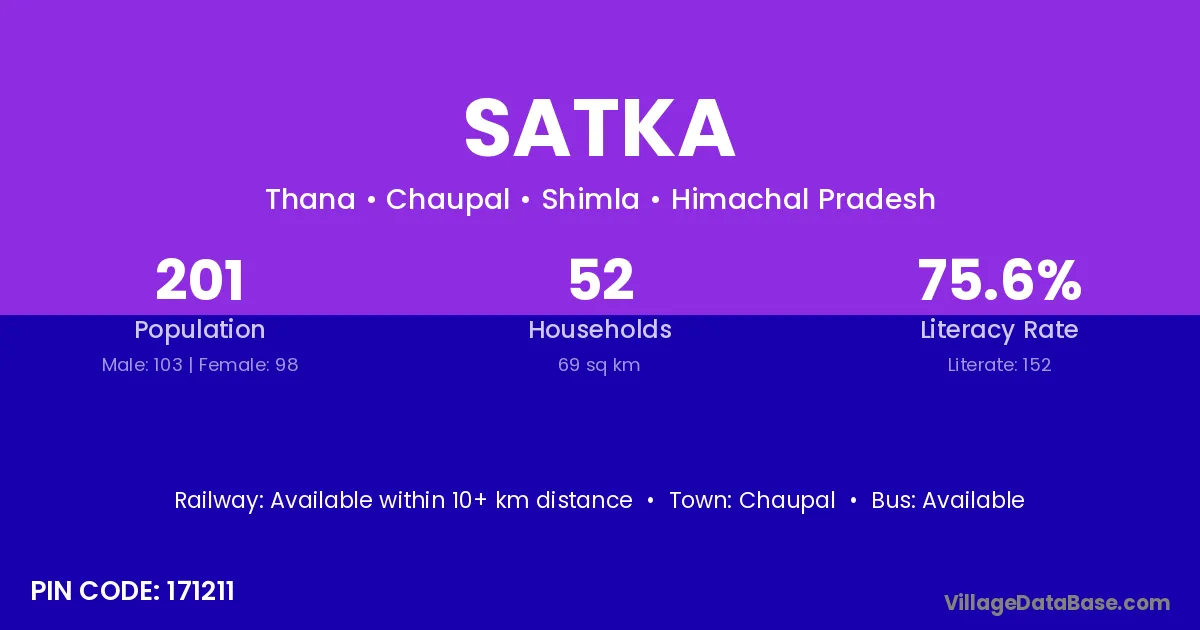 The literacy rate of Satka village is 35.48%. Male literacy stands at 49.16% and female literacy at 20.37%.