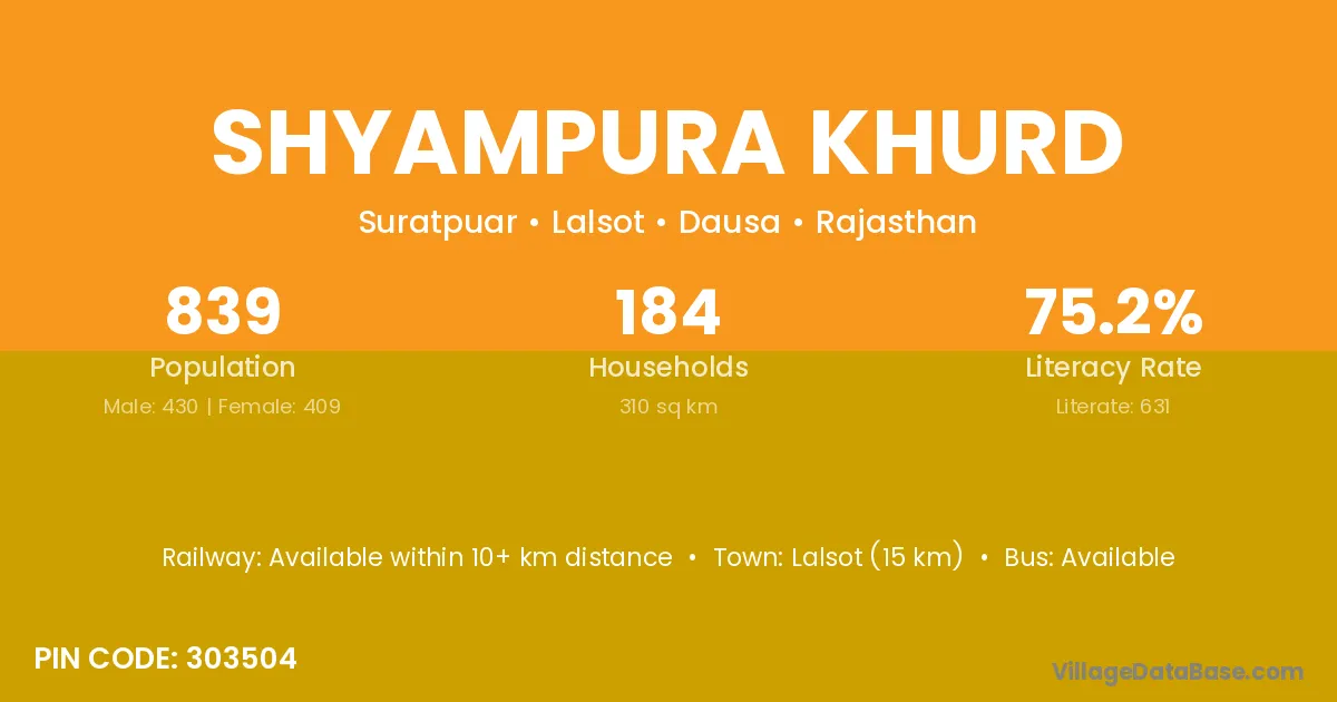 The literacy rate of Shyampura Khurd village is 51.97%. Male literacy stands at 65.82% and female literacy at 36.99%.