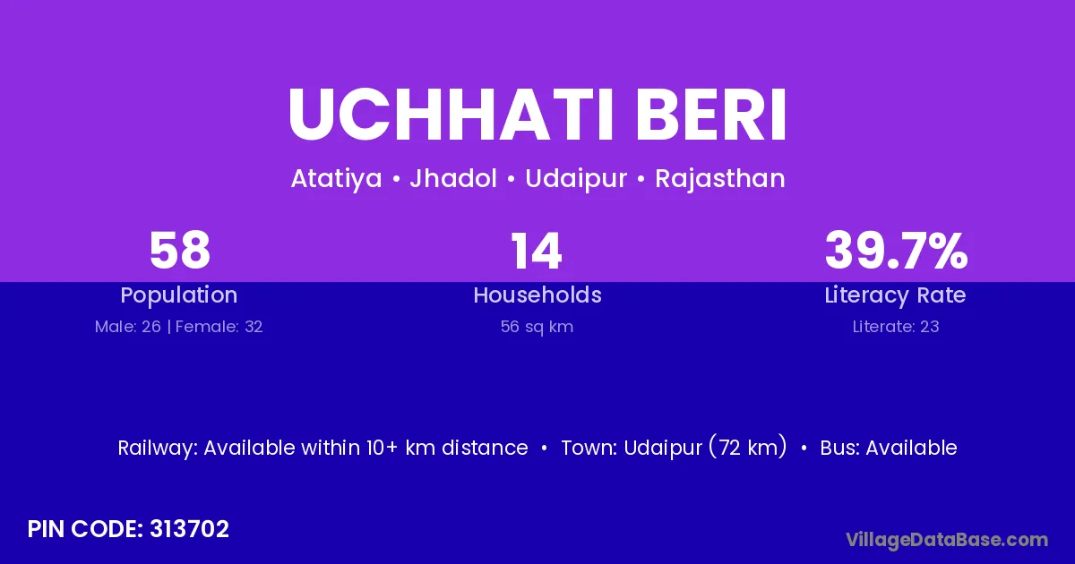 Udaipur (72 km) is the nearest town to Uchhati Beri village for major economic activities and is located approximately 72 km away.