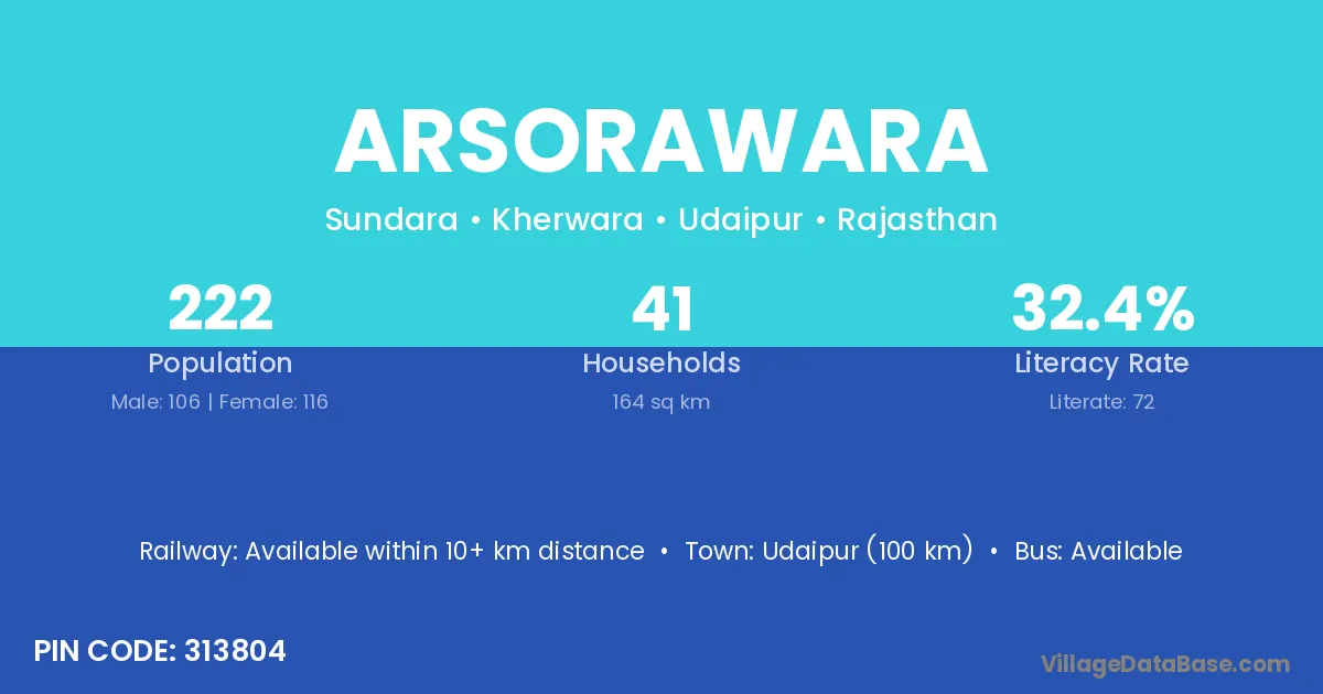 Udaipur (100 km) is the nearest town to Arsorawara village for major economic activities and is located approximately 100 km away.