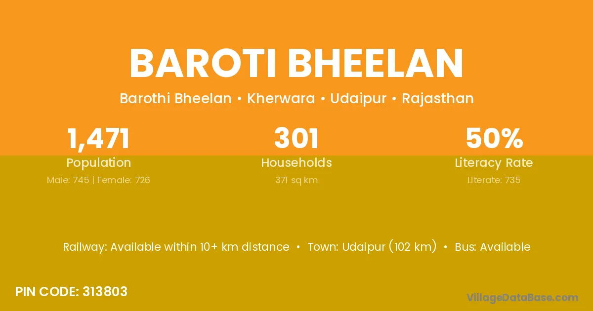Baroti Bheelan village has a total population of 1,471 people, of which 745 are males and 726 are females.