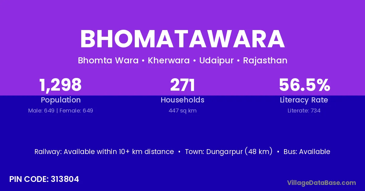 Dungarpur (48 km) is the nearest town to Bhomatawara village for major economic activities and is located approximately 48 km away.