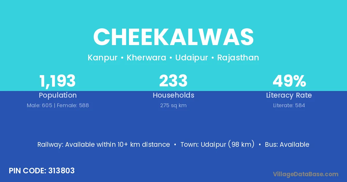 Udaipur (98 km) is the nearest town to Cheekalwas village for major economic activities and is located approximately 98 km away.
