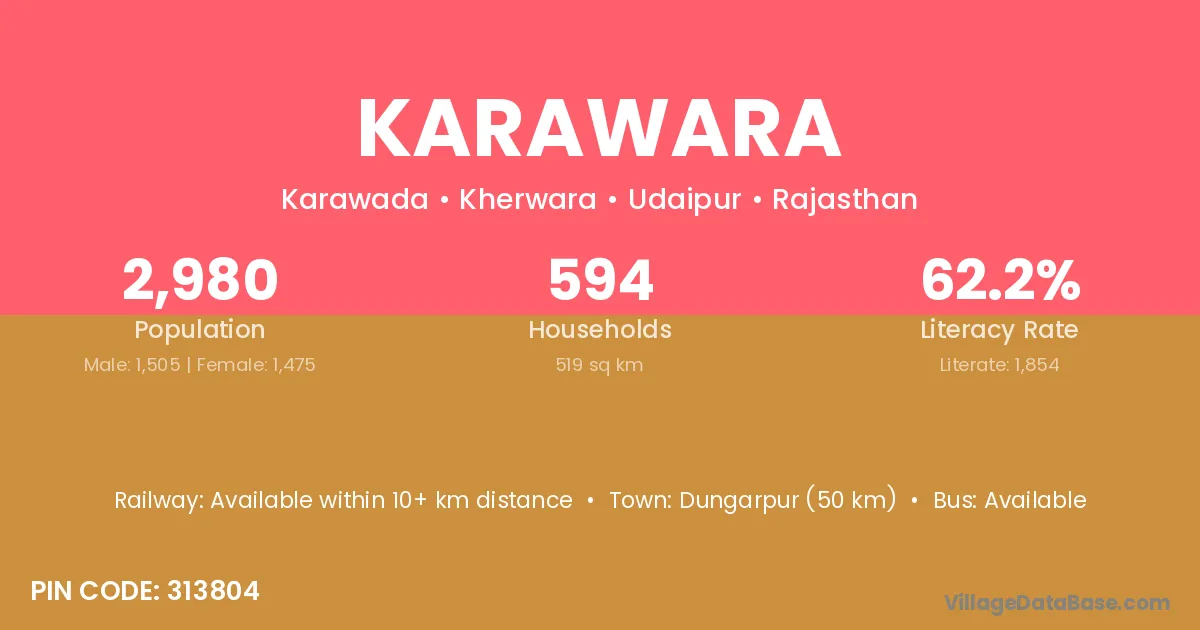 Dungarpur (50 km) is the nearest town to Karawara village for major economic activities and is located approximately 50 km away.