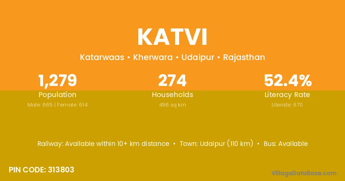 Udaipur (110 km) is the nearest town to Katvi village for major economic activities and is located approximately 110 km away.