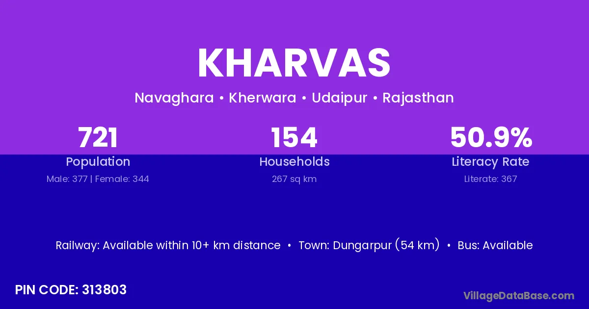 Dungarpur (54 km) is the nearest town to Kharvas village for major economic activities and is located approximately 54 km away.