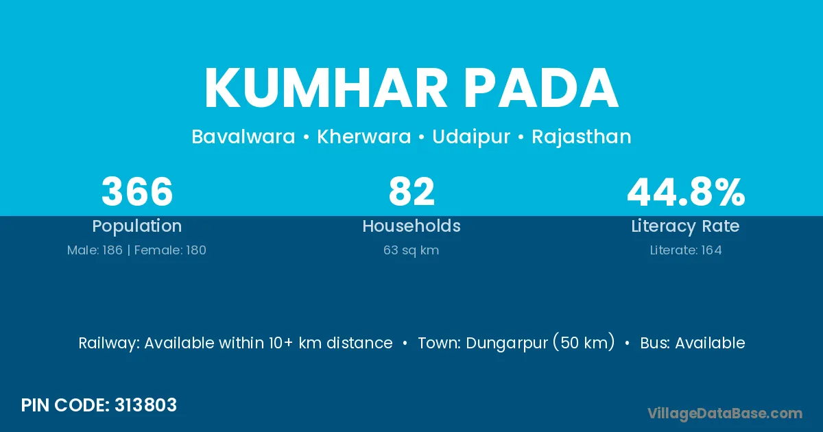 Dungarpur (50 km) is the nearest town to Kumhar Pada village for major economic activities and is located approximately 50 km away.