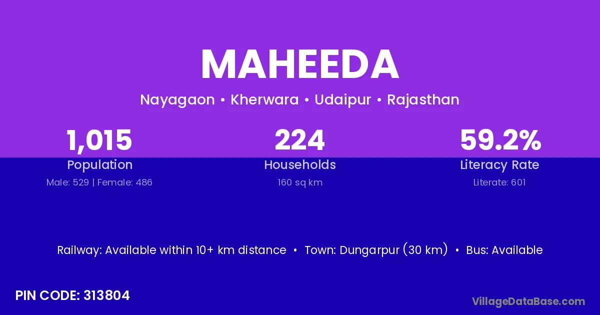 Dungarpur (30 km) is the nearest town to Maheeda village for major economic activities and is located approximately 30 km away.