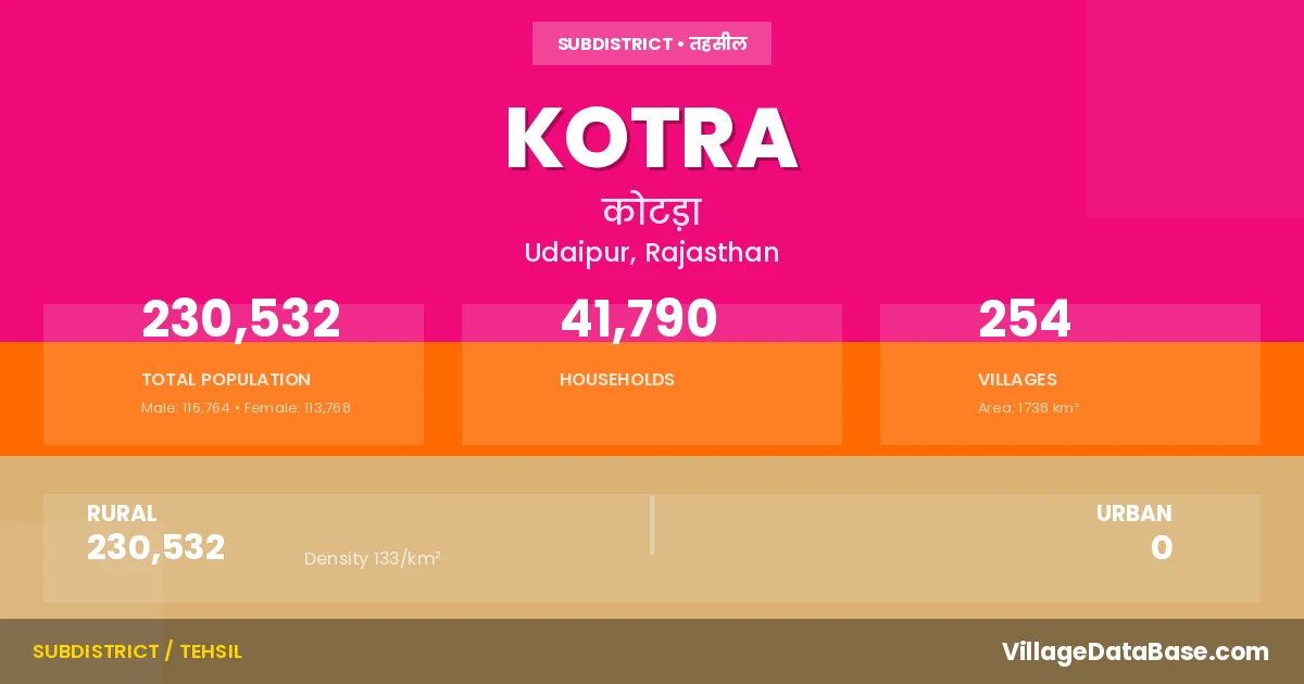 According to the 2011 census The total area of Kotra Tehsil is 1738 km², with a population of 230532 people. The population density is 133 inhabitants per square kilometre, and there are approximately 41790 houses in the sub district.