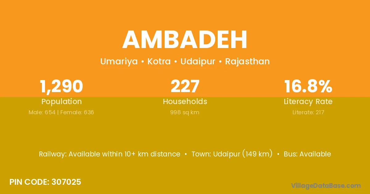 Udaipur (149 km) is the nearest town to Ambadeh village for major economic activities and is located approximately 149 km away.