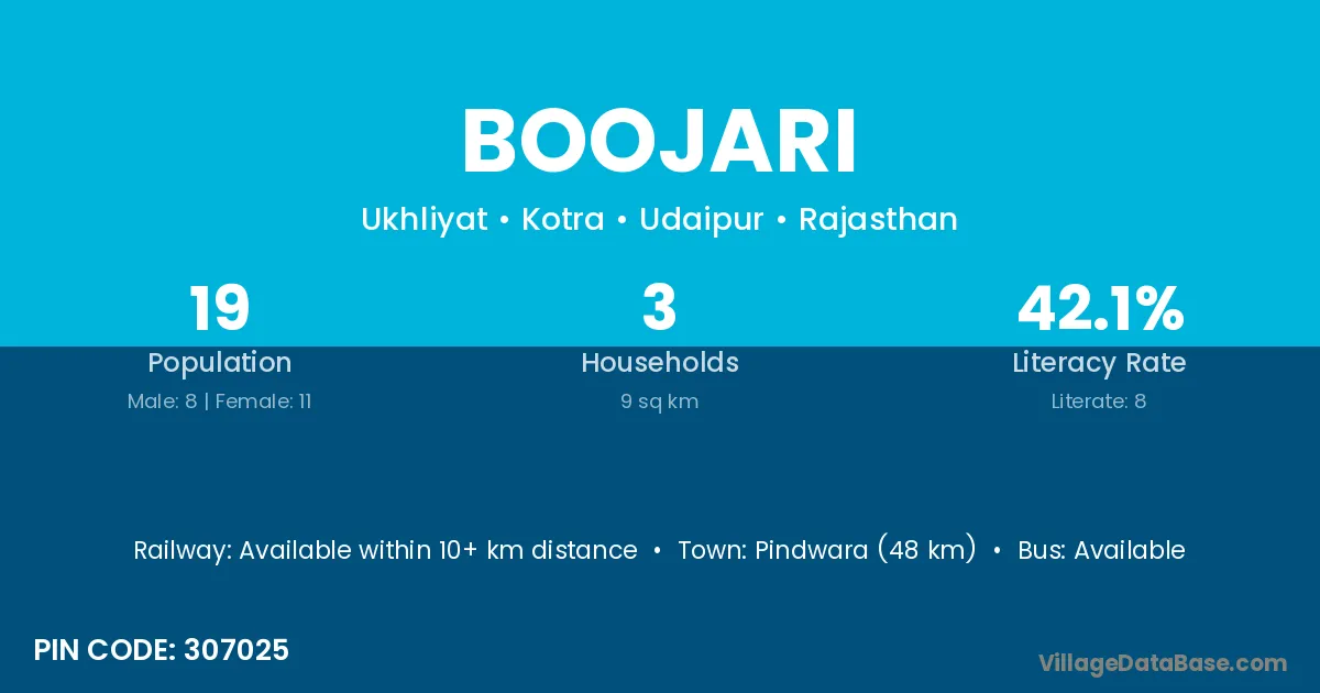 Pindwara (48 km) is the nearest town to Boojari village for major economic activities and is located approximately 48 km away.