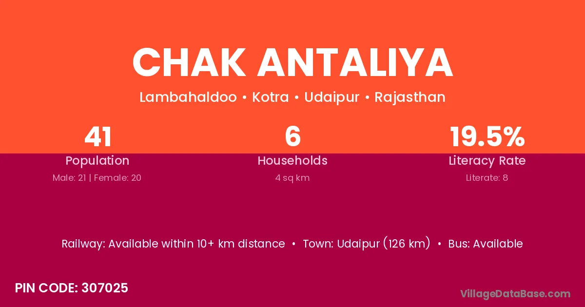 Udaipur (126 km) is the nearest town to Chak Antaliya village for major economic activities and is located approximately 126 km away.