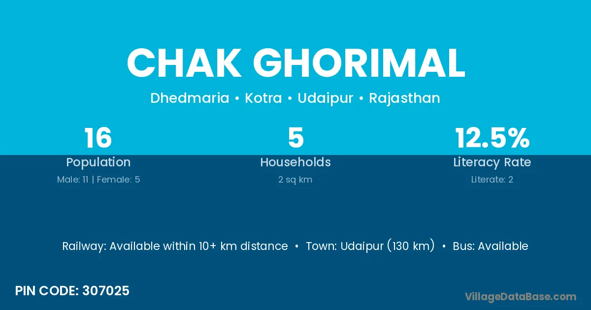 Udaipur (130 km) is the nearest town to Chak Ghorimal village for major economic activities and is located approximately 130 km away.