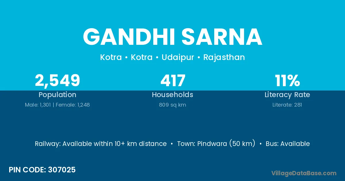 Pindwara (50 km) is the nearest town to Gandhi Sarna village for major economic activities and is located approximately 50 km away.