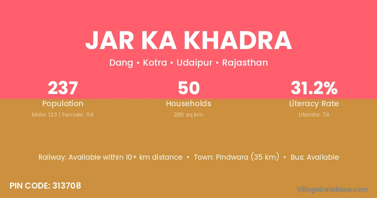 Pindwara (35 km) is the nearest town to Jar Ka Khadra village for major economic activities and is located approximately 35 km away.