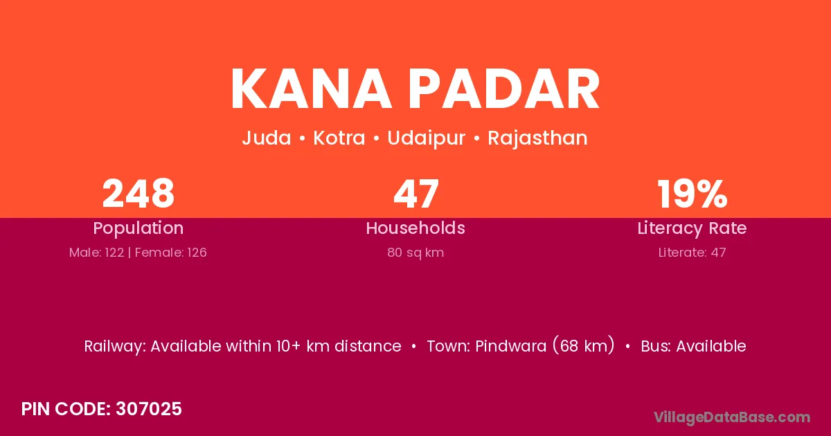 Pindwara (68 km) is the nearest town to Kana Padar village for major economic activities and is located approximately 68 km away.