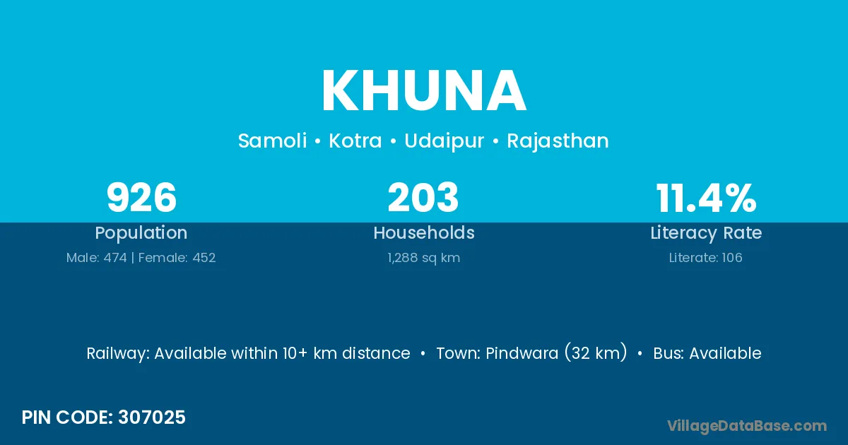 Pindwara (32 km) is the nearest town to Khuna village for major economic activities and is located approximately 32 km away.
