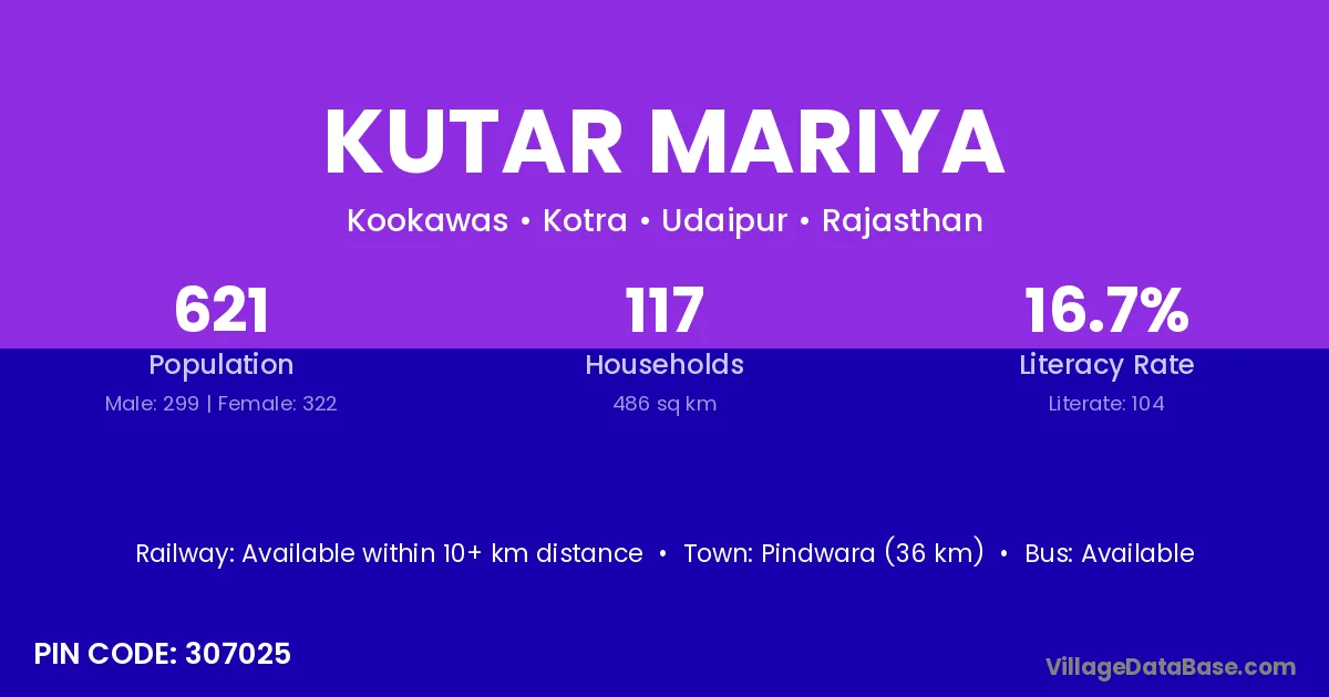 Pindwara (36 km) is the nearest town to Kutar Mariya village for major economic activities and is located approximately 36 km away.