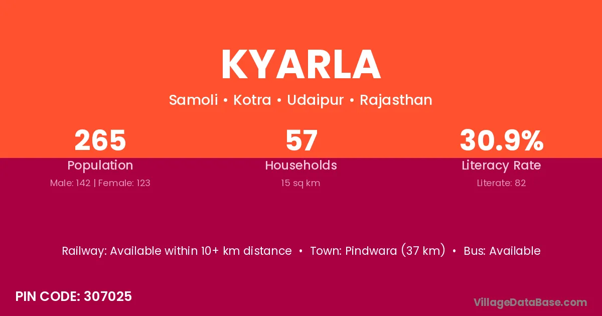 Pindwara (37 km) is the nearest town to Kyarla village for major economic activities and is located approximately 37 km away.