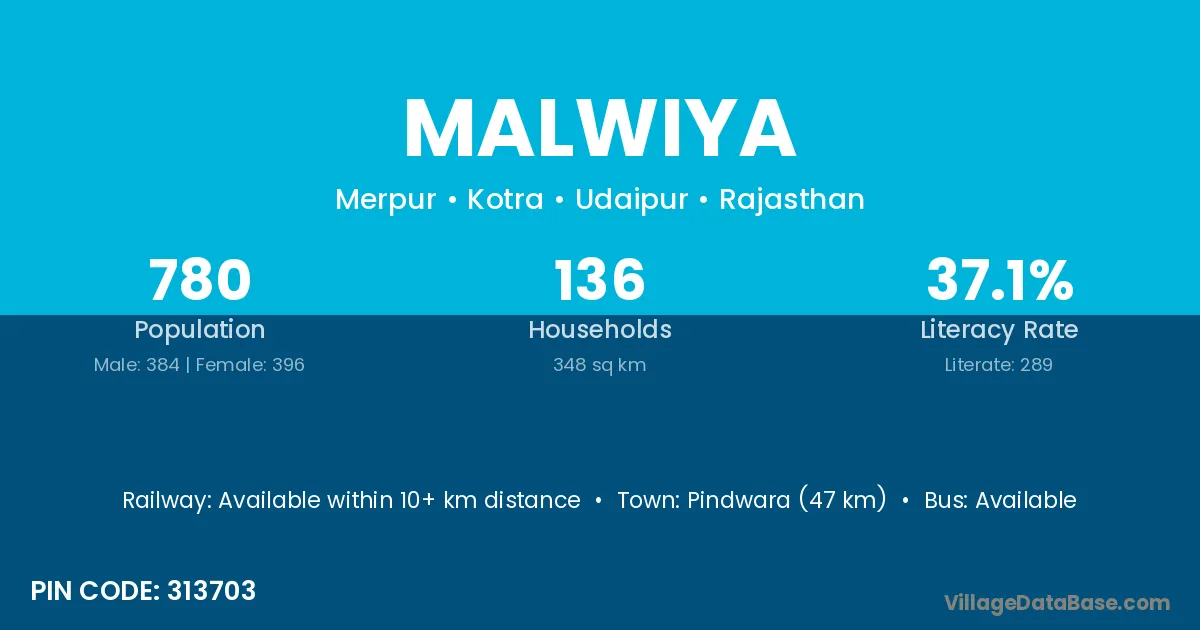 Pindwara (47 km) is the nearest town to Malwiya village for major economic activities and is located approximately 47 km away.